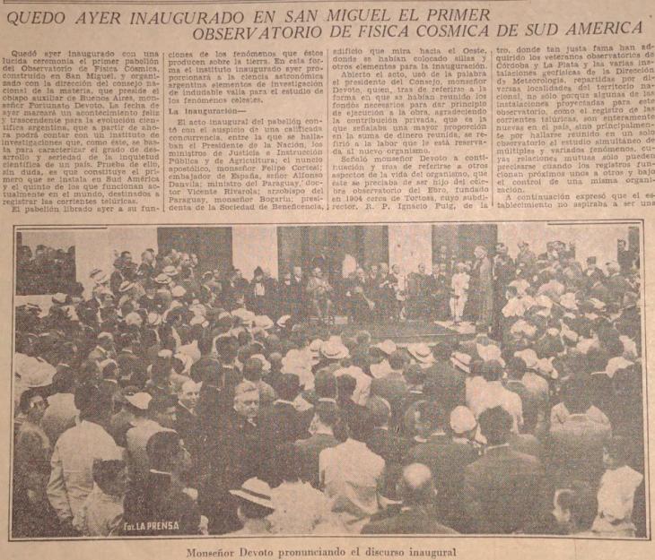 El diario La Prensa cubrió en 1935 la inauguración del Observatorio por el presidente de ese entonces, Agustín P. Justo (Foto gentileza). "Desde que se fundó pasó algún tiempo en armarse todo esto, pero desde 1965 a 1973 para mí fue una época de grandes desarrollos y exploración. Después los avatares del país y la falta de presupuesto lo fueron achicando, hasta que en el 78 los jesuitas se lo vendieron a la Fuerza Aérea, pero con todo: el terreno, los edificios, el instrumental, los proyectos y el personal, con lo cual no nos podían despedir. Eso en parte fue muy bueno, pero algunos proyectos no les interesaban y sólo incentivaron los propios. Luego el observatorio pasó a manos de la Comisión Nacional de Investigaciones Espaciales (CONIE), y una vez que se dio de baja el proyecto Cóndor, los que trabajaban en satélites pasaron a la CONAE'', señaló a este periodista el geólogo Jorge Rusansky.
