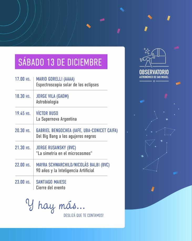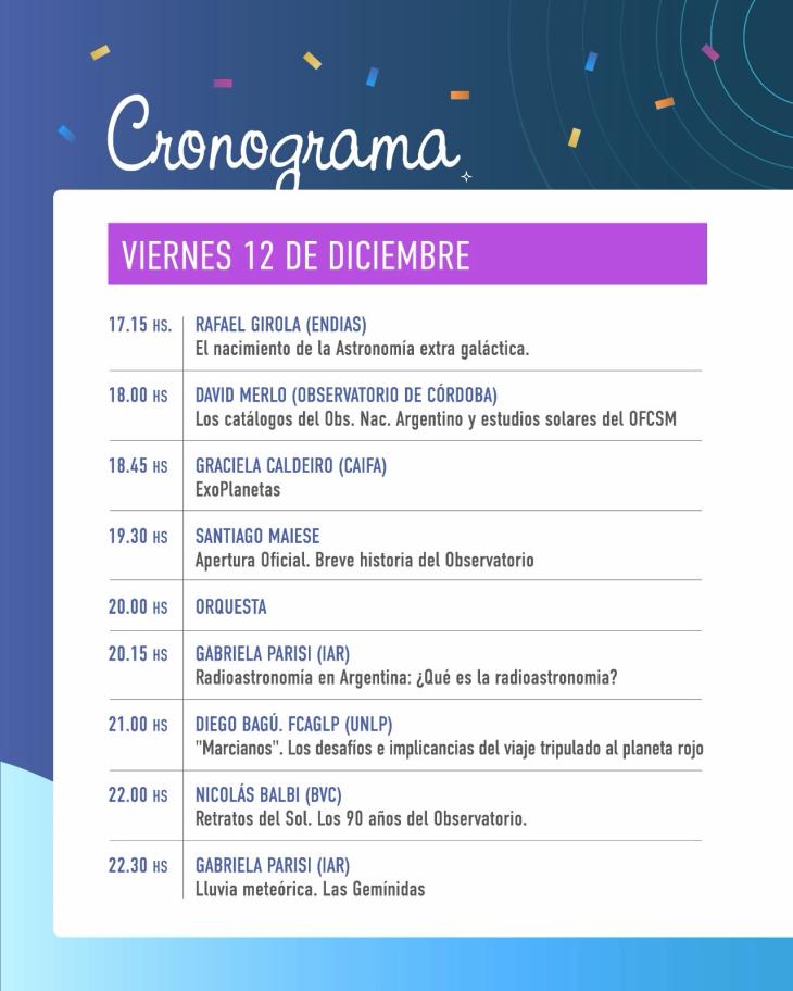 Para conmemorar estas nueve décadas, las actividades se desarrollarán hoy y mañana con entrada libre y gratuita. Habrá charlas de especialistas, muestras interactivas, observación con telescopios, espectáculos musicales y propuestas para toda la familia. Entre las atracciones figuran la exposición de relojes solares y astrolabios, una muestra de minerales y material extraterrestre, el domo inflable con proyecciones astronómicas, y la participación del Museo de Ciencias Naturales Bernardino Rivadavia y el Museo de Mariposas del Mundo, como así también una charla del prestigioso astrónomo de la Universidad de La Plata Diego Bagú.
