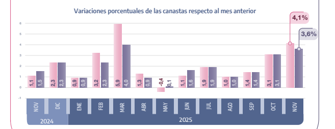 Por su parte, la Canasta Básica Total (CBT) se calculó en $406.902,60 para un adulto equivalente, incrementándose 3,6% en relación a octubre.