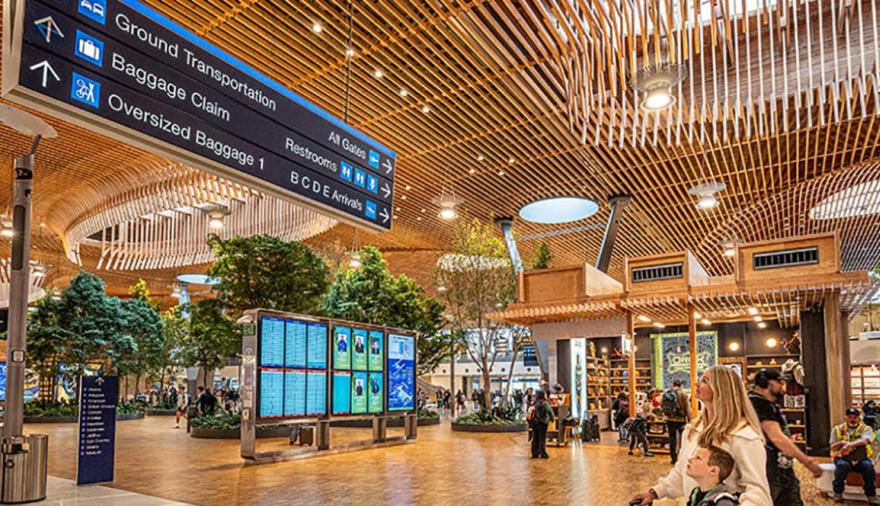 Portland International Airport (Estados Unidos): uno de los proyectos de mass timber más grandes del país. Su nuevo techo ondulado en madera crea una sensación de “bosque interior”, con árboles vivos y jardines dentro del terminal.