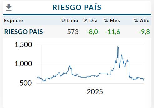 El riesgo país retrocedió con fuerza y cayó a 573 puntos básicos, lo que implica una baja cercana al 8% en la jornada y lo ubica en su nivel más bajo del año.