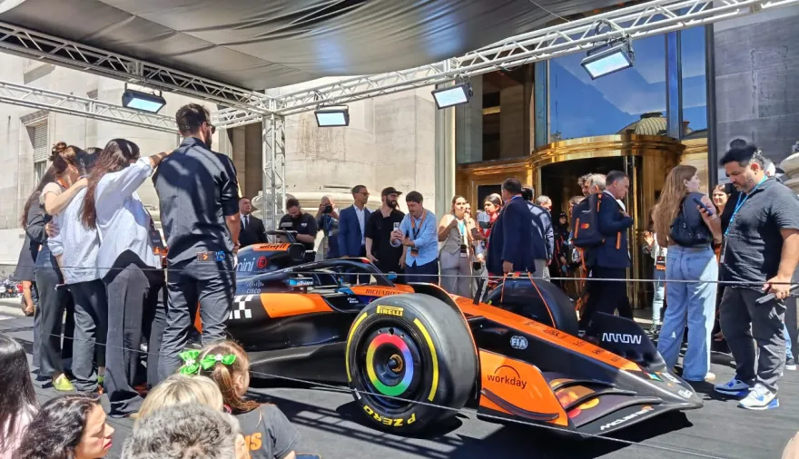 La réplica del monoplaza McLaren con que Lando Norris se consagró campeón mundial de Fórmula 1 en 2025 está exhibida frente a la Casa Rosada, en la vereda del Banco Nación.