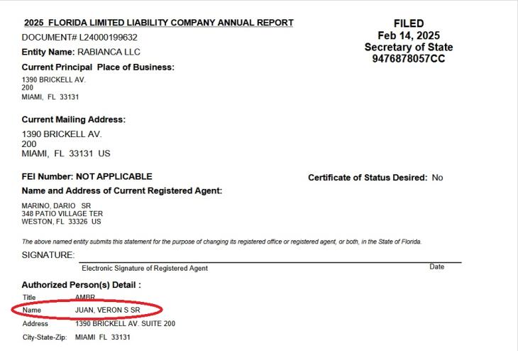 Verón pasó de figurar como Director/Officer inactivo en la lista inicial a ser propietario estratégico a través de su holding RABIANCA LLC, mientras que el uso de figuras como Facundo García y Pepe Sánchez como AMBRs temporales, podría interpretarse como una maniobra de estratificación (layering) para el ocultamiento temporal del capital final.