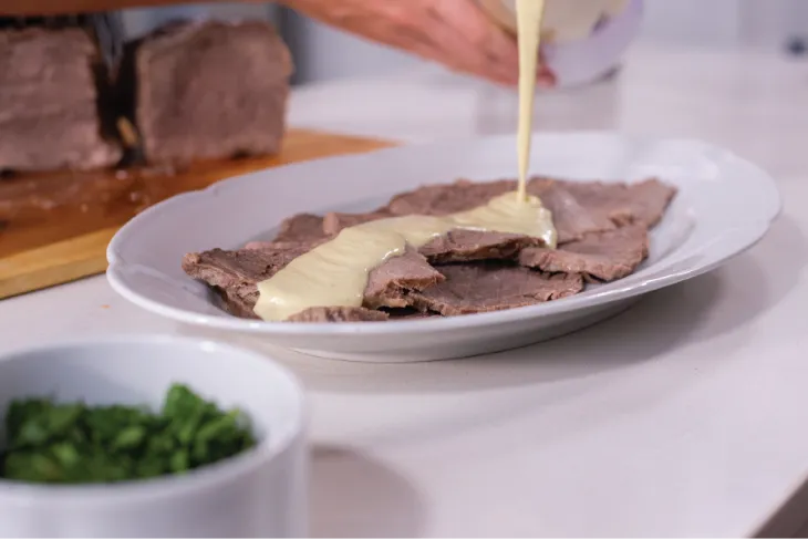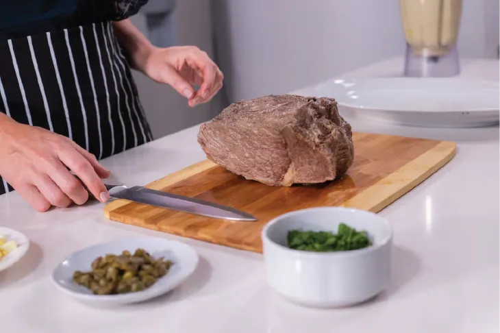 Mientras que para la salsa el procedimiento consiste en desmenuzar las anchoas en aceite y mezclar junto al atún, la mayonesa y una cucharada de limón. Mixear los ingredientes y procesar hasta lograr una salsa homogénea. Añadir la crema de leche, incorporar todo con cuchara o espátula, sin mezclar para evitar que la salsa se corte. Sazonar con pimienta blanca. Por último, para el armado final, retirá el peceto de la olla de cocción y cortar en rodajas muy finas.