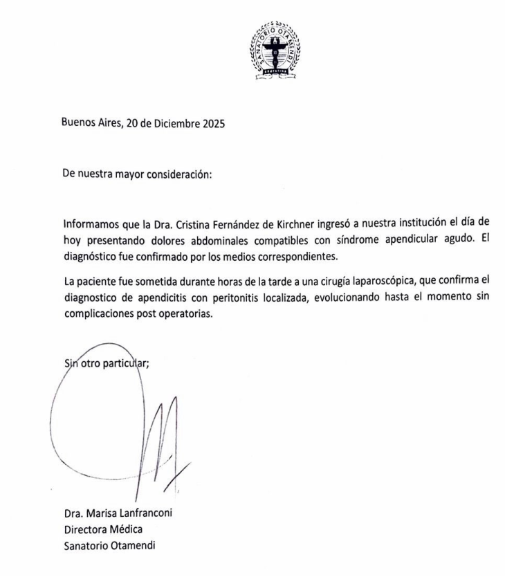 La expresidenta Cristina Kirchner fue intervenida quirúrgicamente este sábado en el Sanatorio Otamendi, luego de ingresar a la institución con un cuadro de dolor abdominal compatible con un síndrome apendicular agudo.
