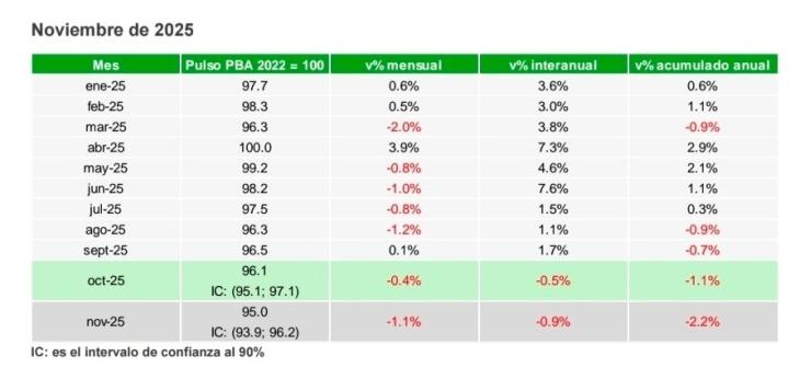 Este sesgo también se refleja en los indicadores adelantados. Según el índice de actividad elaborado por el Banco Provincia de Buenos Aires, el último dato disponible para noviembre de 2025 muestra que la actividad en la provincia se ubicó en 95,0 puntos (base 2022 = 100), con una baja mensual del 1,1%, una caída interanual del 0,9% y un acumulado anual negativo de 2,2%.