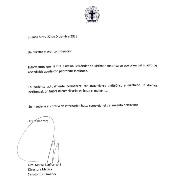 “Informamos que la Dra. Cristina Fernández de Kirchner continúa su evolución del cuadro de apendicitis aguda con peritonitis localizada”, señaló la directora médica del Sanatorio Otamendi, Marisa Lanfranconi, en el comunicado oficial.