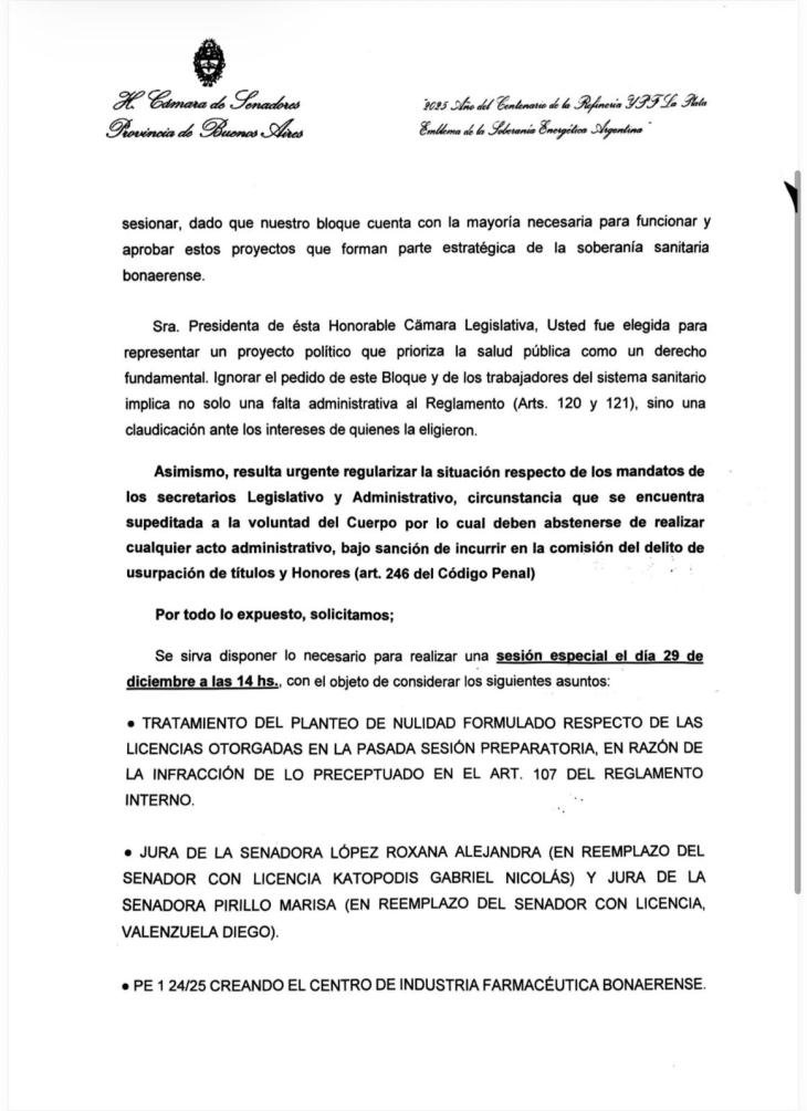 La nota, dirigida a la presidenta del Senado, la vicegobernadora Verónica Magario, invoca artículos del Reglamento Interno y advierte sobre la “correcta continuidad administrativa” de la Cámara. El planteo fue ingresado el 23 de diciembre y cuenta con la firma de varios senadores del oficialismo, que reclaman la convocatoria a una sesión especial el 29 de diciembre.