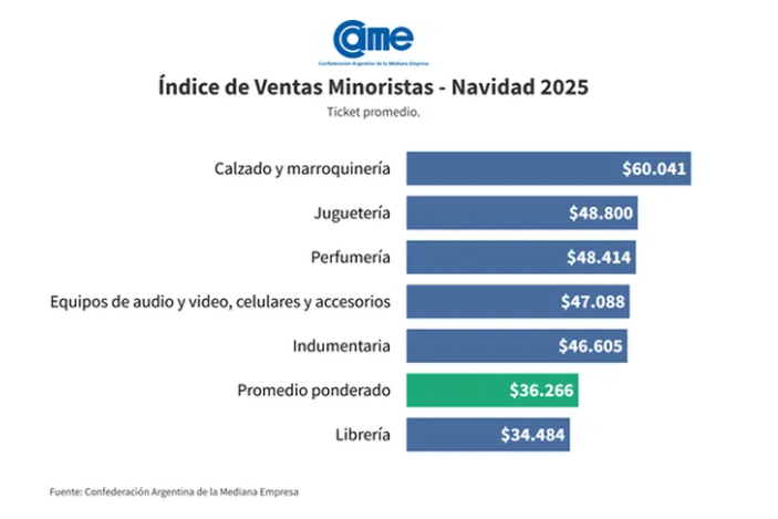El ticket promedio de las compras navideñas alcanzó los $36.266, con marcadas diferencias entre rubros. El valor más alto se registró en calzado y marroquinería, con un promedio de $60.041, mientras que el más bajo correspondió a librerías, con $34.484.
