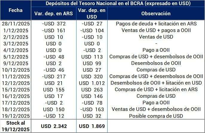 La atención del mercado también está puesta en la posición financiera del Tesoro. Al 19 de diciembre, los depósitos en moneda extranjera sumaban apenas USD 1.869 millones, un nivel que contrasta con los vencimientos por unos USD 4.200 millones previstos para el próximo 9 de enero.