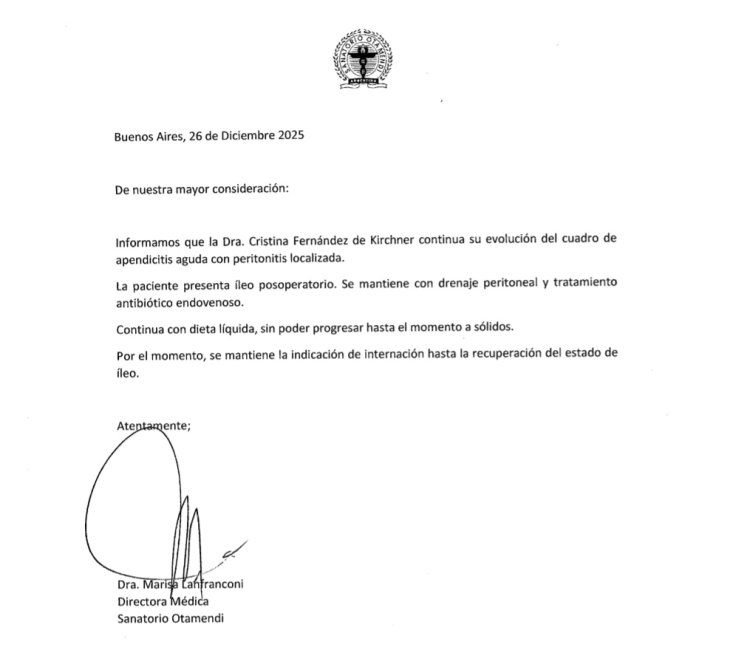 El Sanatorio Otamendi difundió un nuevo parte médico sobre la evolución clínica de la expresidenta Cristina Kirchner, quien permanece internada tras haber sido intervenida quirúrgicamente por un cuadro de apendicitis aguda con peritonitis localizada.
