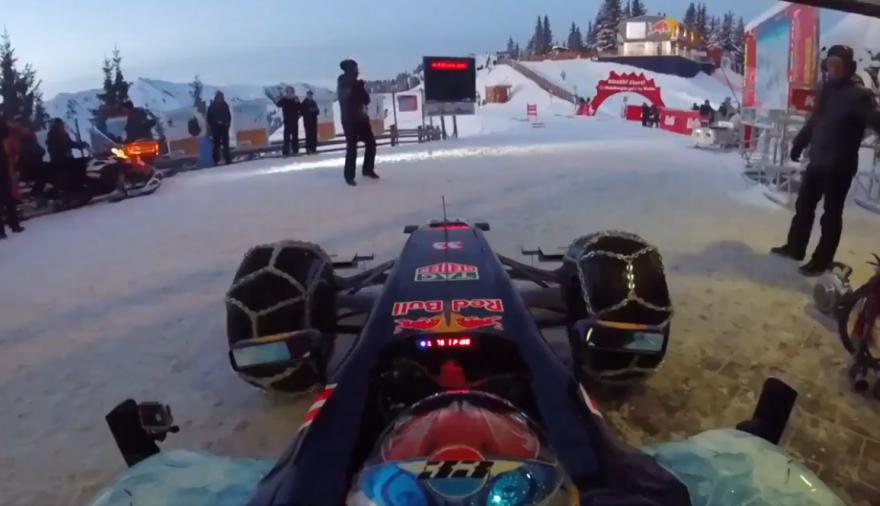 A diferencia de un kart -más pequeño, ligero y sin la sofisticada aerodinámica de un Fórmula 1-, este monoplaza cuenta con alas, nariz y estructura similar a la de un coche de Gran Premio, pero equipado con neumáticos especiales (con cadenas) para poder circular y derrapar controladamente en hielo y nieve. La escena, grabada en un entorno montañoso nevado, combina diversión con una exhibición impresionante de habilidad, manteniendo el característico estilo agresivo y preciso que define al piloto.