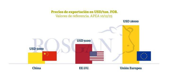 Si el análisis se extiende entre enero y noviembre de 2025, de las 665.000 toneladas despachadas, el 70% -unas 461.000 toneladas- fueron hacia el gigante asiático, con una cotización promedio de USD 3.800 por tonelada.