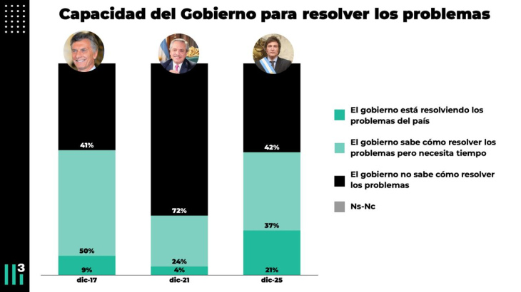 En diciembre de 2017, apenas 9% de los consultados pensaba que el gobierno de Mauricio Macri ya resolvía los problemas; esa percepción sube a 21% en 2025 bajo Milei.