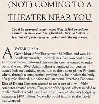 El principal obstáculo no era la historia en sí, sino las limitaciones técnicas de la época, lo que la publicación denominó como el "beso de la muerte" para el proyecto. En aquel momento, la idea de personajes digitales fotorrealistas parecía una fantasía inalcanzable. Se mencionaba que “Cameron quería utilizar un elenco de actores creados por computadora ultra realistas. Además, la mayoría de los efectos especiales necesarios para representar Pandora habrían tenido que ser inventados”. Ante estos desafíos, el costo estimado resultaba prohibitivo: “El presupuesto de Avatar: unos asombrosos 400 millones de dólares. Ningún estudio lo financiaría, por lo que la película fue descartada”.
