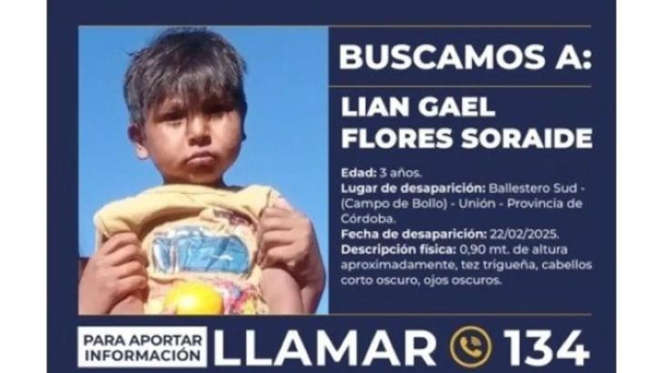El 22 de febrero de 2025 desapareció Lian Gael Flores Soraide, de 3 años, en Ballesteros Sud (Campo de Bollo), departamento Unión, Córdoba. A fin de año, el niño seguía siendo buscado, con pedido oficial de paradero vigente y una investigación que no logró dar una respuesta concluyente.