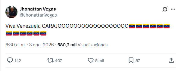 Uno de los deportistas más efusivos a la hora de expresarse por esta situación fue el golfista Jhonattan Vegas, estrella del golf venezolano que vive en Estados Unidos. En un tuit cargado de emoción, escribió en la red social X: "Viva Venezuela CARAJOOOOOOOOOOOOOOOOOO", acompañado por 12 banderas de su país.