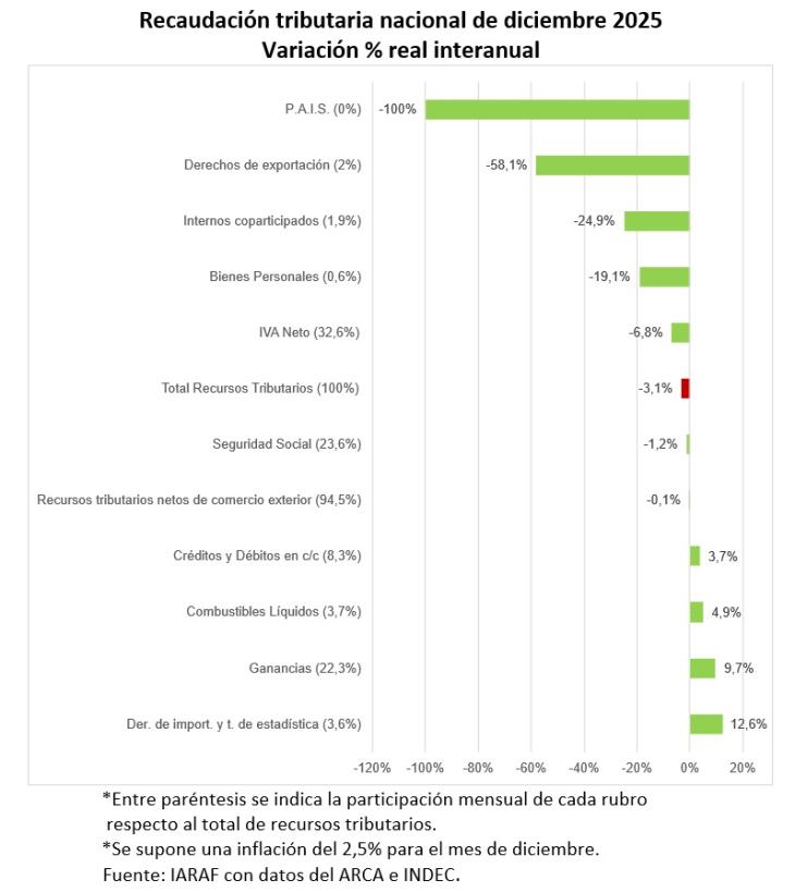 *La recaudación tributaria nacional total habría descendido un 3% real interanual durante diciembre de 2025. Al excluir la recaudación por tributos vinculados al comercio exterior, la variación real interanual sería nula.*