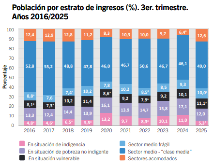 La reducción de las personas en situación de pobreza se dio en detrimento del crecimiento de todas las otras categorías. Entre el tercer trimestre de 2024 y el tercer trimestre de 2025, el sector en “situación vulnerable” aumentó del 10,1% al 11,1%.