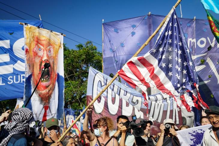 Este lunes por la tarde, una masiva movilización que superó en convocatoria a la del pasado sábado se concentró frente a la embajada de Estados Unidos en el barrio porteño de Palermo. Convocada por un amplio espectro de organizaciones políticas, sindicales y sociales, la marcha tuvo como eje el repudio a la intervención de Donald Trump en Venezuela y la exigencia de libertad para el detenido Nicolás Maduro y su esposa Cilia Flores.