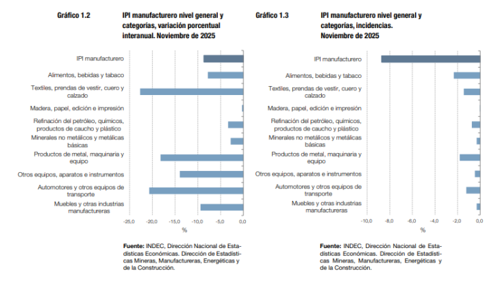 En noviembre de 2025, el índice de producción industrial manufacturero (IPI manufacturero) registró un desplome del 8,7% interanual, mientras que en la comparación contra octubre la variación también fue negativa: -0,6%
