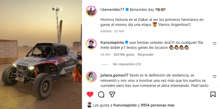 El logro de los hermanos Benavides fue resaltado por la organización del Dakar como un hito histórico, ya que nunca antes dos hermanos habían ganado etapas el mismo día en distintas categorías. La hazaña se completó con otros festejos argentinos: la pareja compuesta por Nicolás Cavigliasso y Valentina Pertegarini se ubicó en el tercer puesto de la etapa, a 5m40s de Benavides y Sisterna. Y como si fuera poco, Jeremías González Ferioli también celebró en Side by Side (ver aparte).