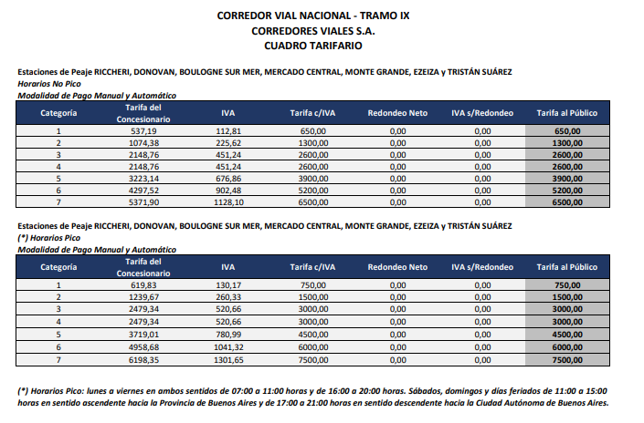 Asimismo, el Tramo IX comprende los peajes del Acceso Riccheri y su sistema de autopistas vinculadas, incluyendo las estaciones de Riccheri, Donovan, Boulogne Sur Mer, Mercado Central, Monte Grande, Ezeiza y Tristán Suárez, donde se aplican tarifas diferenciadas según horarios pico y no pico.