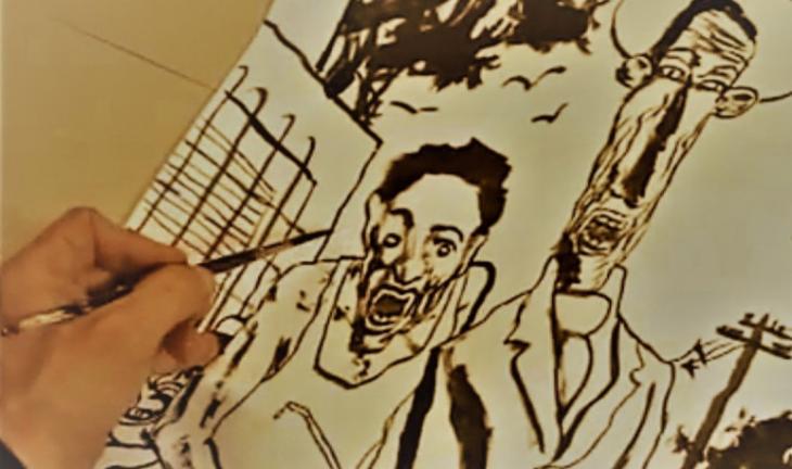 Tríptico para dibujo de Historieta en vivo. En Casa de la Cultura, Teatro 25 de Mayo y Planetario, páginas de 1,30 x 0,90 m realizadas por tres dibujantes en simultáneo.