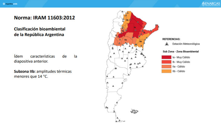 La clasificación utilizada por la Secretaría de Energía se basa en la norma IRAM 11603:2012, que divide al país en distintas regiones bioambientales según temperaturas medias, máximas, amplitudes térmicas y características estacionales.
