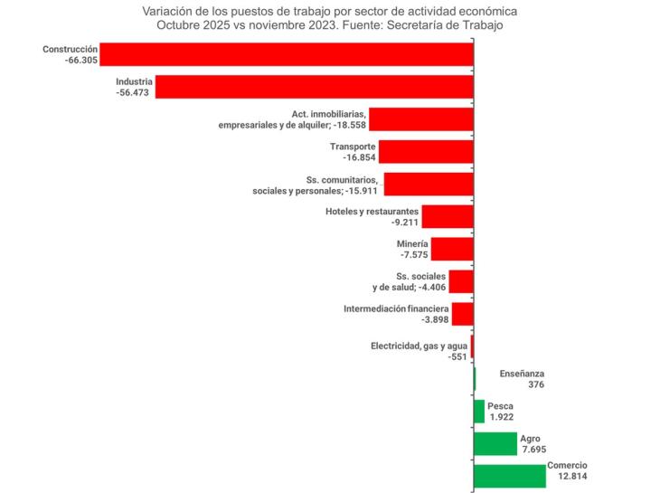 Este rendimiento no llegó a contrarrestar las enormes caídas de la Construcción (-66.305) y la Industria (-56.473). Estos dos sectores explican el 69% del empleo perdido, siendo los principales afectados del modelo económico actual.