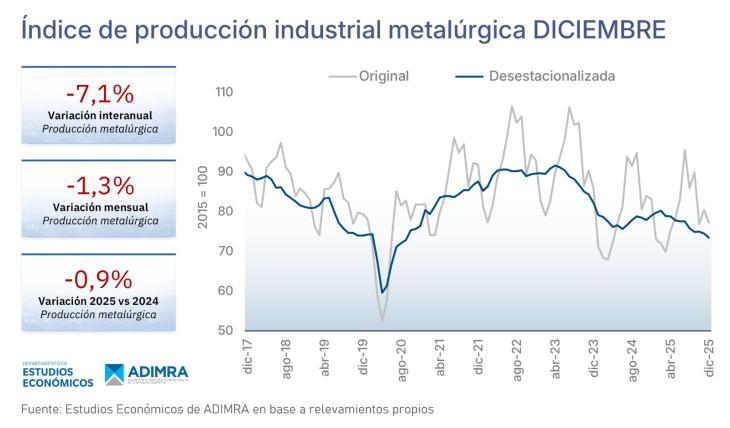 De acuerdo con el informe de ADIMRA, la Asociación de Industriales Metalúrgicos de la República Argentina, en diciembre, la producción de dicho sector se derrumbó 7,1% interanual y 1,3% intermensual.