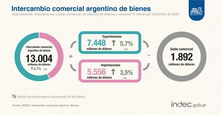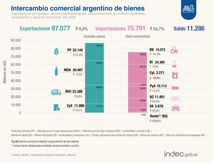 En el análisis anual, en 2025, las exportaciones totalizaron los USD 87.077 millones, un aumento respecto a 2024 de 9,3%, mientras las importaciones alcanzaron los USD 75.791 millones, con una suba interanual de 24,7%.