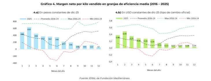 Medido en pesos a diciembre de 2025, el margen neto promedio de una granja con eficiencia media se ubicó en $289 por kilo producido durante el año. Ese resultado representó una caída del 16% respecto del promedio anual registrado en eñl períodod comprendido entre los años 2016 y 2024.