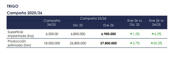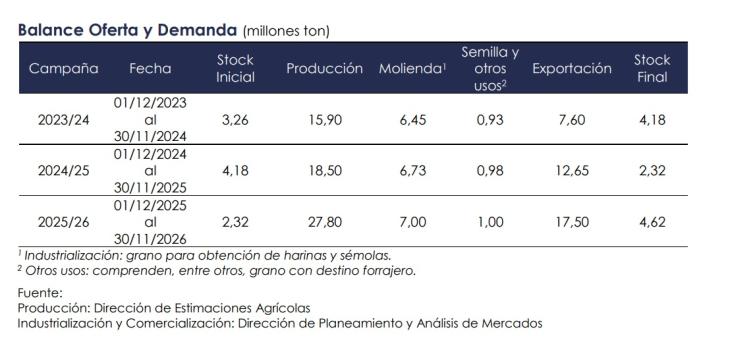 Esta gran campaña representa una mejora de 26% en comparación al ahora segundo mejor registro del cereal, cuando se cosecharon 22,1 millones de toneladas en el ciclo 2021/22. Si se compara frente a la campaña 2024/25, la mejora fue del 50,3%: en aquel ciclo se cosecharon 18,5 millones de toneladas.