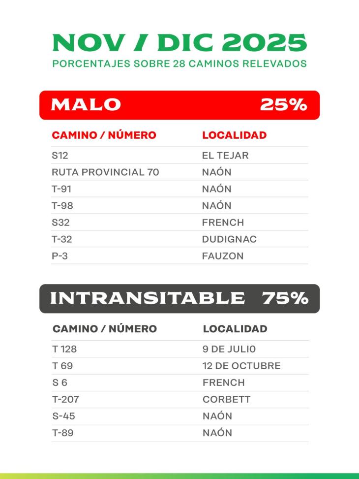 Según los datos correspondientes a noviembre y diciembre de 2025, el 75% de los caminos relevados estaba intransitable y el 25% restante presentaba un estado malo, sobre un total de 28 trazas evaluadas.