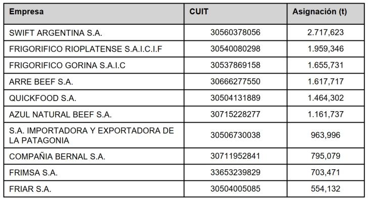 La cuota se dividió en las categorías “Industria” y “Proyectos Conjuntos”. En el primer caso, fueron 19.000 toneladas que se repartieron entre 37 empresas. Las principales firmas beneficiadas fueron Swift Argentina (2.717,6 toneladas), Frigorífico Rioplatense (1.959,3 toneladas) y Frigorífico Gorina, con 1.655 toneladas asignadas. Entre las diez primeras empresas del listado, concentraron 13.592,3 toneladas, un 71,5% del total asignado para esta categoría.