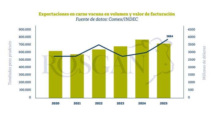 La entidad explicó que esta combinación de menor volumen y mayor facturación “refleja una suba en los valores promedio de exportación del producto”, que se reflejó en un nuevo máximo histórico, en términos de divisas para la cadena de carne vacuna.