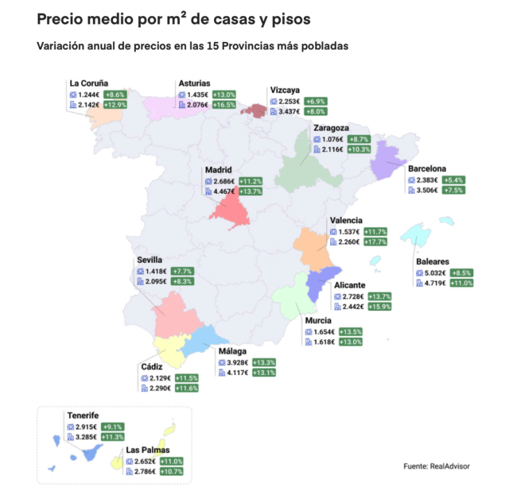 Este desempeño no se limita a grandes capitales. El informe muestra subas generalizadas en la mayoría de las provincias, con especial intensidad en el arco mediterráneo —Valencia, Alicante y Málaga— y en Madrid. En mercados de alta gama, como Baleares, los precios superan los 5.000 euros por metro cuadrado, impulsados por la demanda internacional y la escasez de producto disponible.