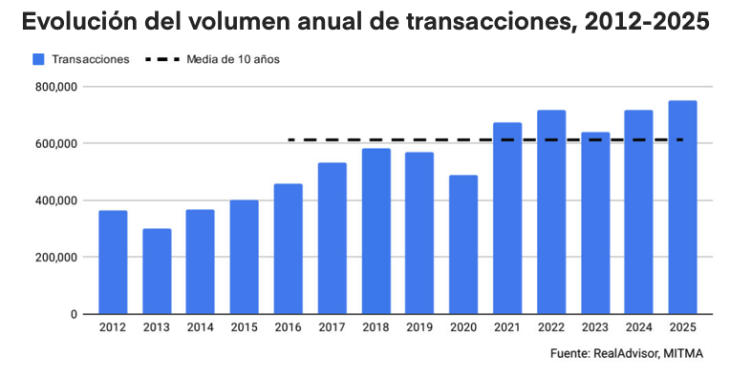 El aumento de precios no frenó la actividad. Según RealAdvisor, durante 2025 se registraron casi 750.000 operaciones de compraventa, un crecimiento interanual del 4,8 % y uno de los volúmenes más elevados desde la crisis financiera de 2008. El cuarto trimestre confirmó un mercado ágil, con plazos de venta reducidos en zonas donde la oferta es limitada.