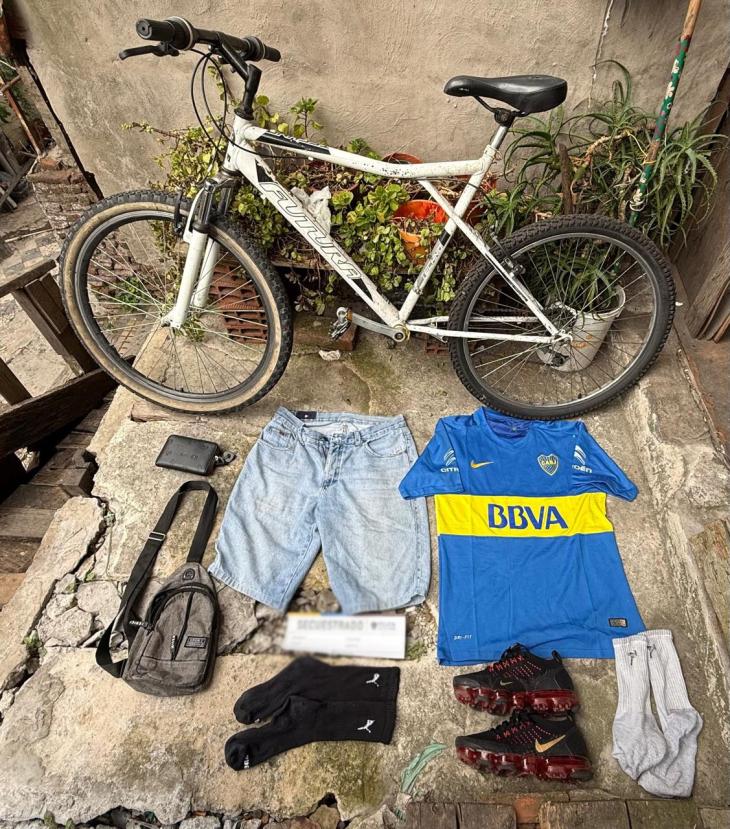 Los detectives de la DIC 4 lograron la detención del delincuente en la vía pública y luego ingresaron a su domicilio donde secuestraron las prendas utilizadas por el imputado durante los robo, entre ellas un par de zapatillas negras, además de una bicicleta 21 Futura, una billetera negra y un morral gris.