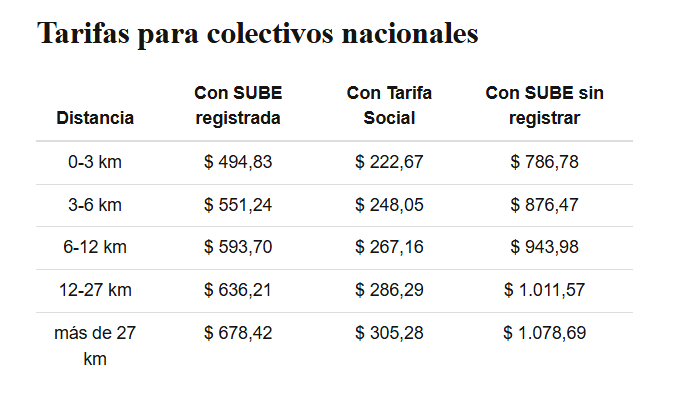 De este modo, las tarifas de los colectivos nacionales pasarán de un mínimo de $494,83 (para viajes de 0 a 3 kilómetros) a $650 a partir de la semana que viene, a $700 en un mes.
