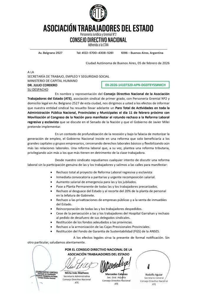 La Asociación Trabajadores del Estado (ATE) ratificó este lunes un paro nacional de 24 horas para el próximo miércoles, con movilización al Congreso, en rechazo al proyecto de Reforma Laboral impulsado por el Gobierno de Javier Milei. La decisión expuso la creciente tensión dentro del sindicalismo, ya que el llamado se mantiene aunque la CGT no haya convocado a una huelga general.
