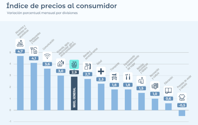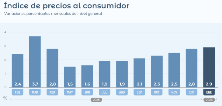 La inflación de enero fue del 2,9%, según informó este martes el INDEC, 0,1 puntos porcentuales por encima del mes anterior, diciembre, que fue de 2,8%.