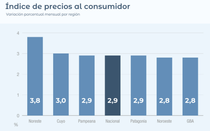 En cuanto a las regiones, Noreste picó en punta (3,8%) en enero, seguido de Cuyo (3%) y Pampeana y Patagonia (2,9%). Noroeste, por su parte, se movió apenas por debajo de la inflación general (2,8%), al igual que GBA.