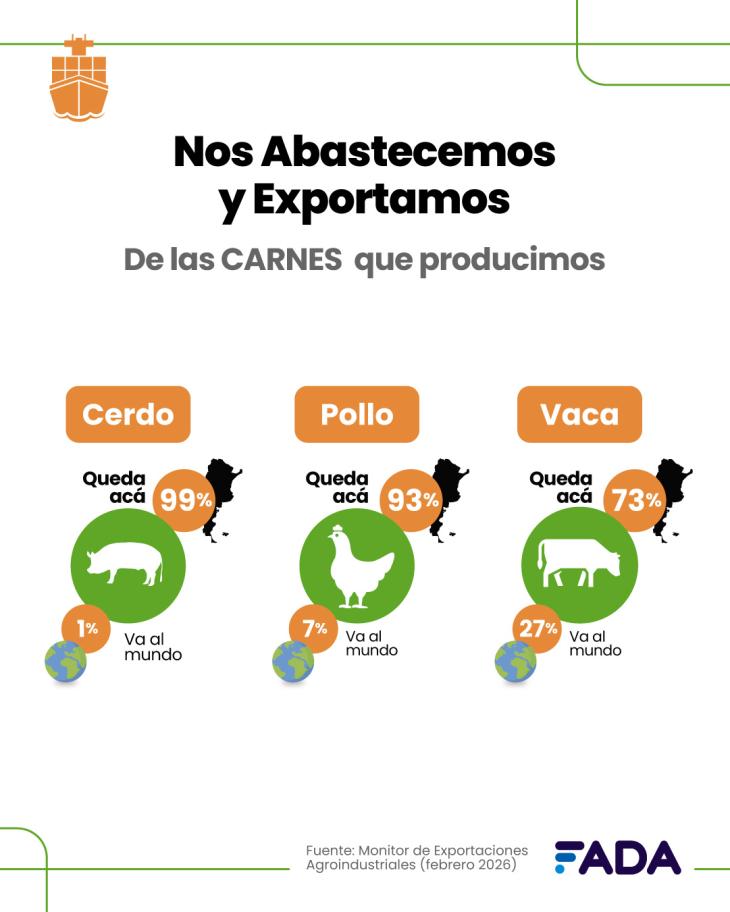 Al desagregar por destinos, los granos se despachan en gran parte a Perú, Brasil, Arabia Saudita, india, Vietnam y China. En carnes, FADA identificó a China, Estados Unidos, Israel, Alemania y Países Bajos como los principales compradores. En el caso de las economías regionales, la lista es encabeza por Brasil, Estados Unidos. España, Italia y China.