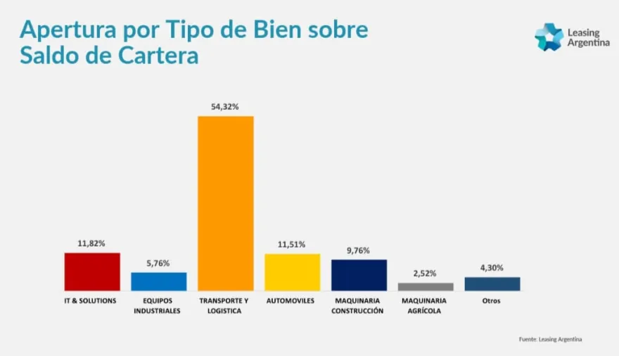 En cuanto al destino de los fondos, el 65,8% del saldo de cartera se concentró en transporte y logística (incluye automóviles); 11,8% en tecnología y telecomunicaciones; 9,8% en maquinaria de construcción; 5,8% en equipos industriales y 2,5% en maquinaria agrícola.