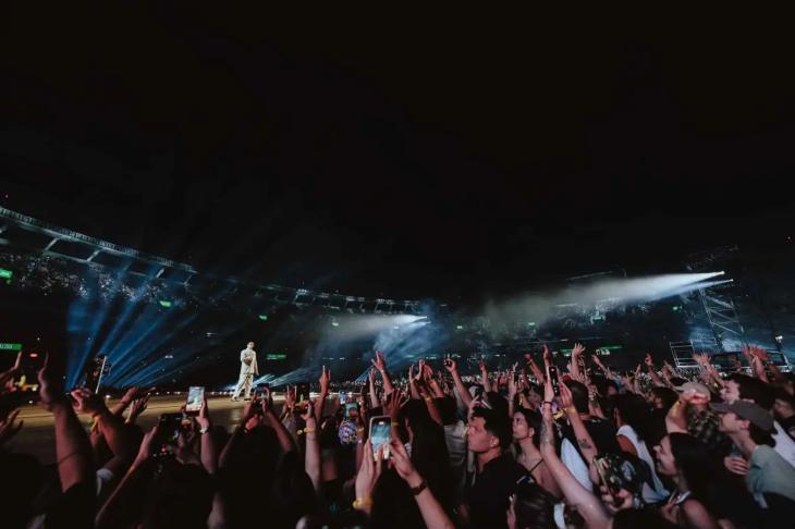 Esta serie de tres presentaciones en el estadio Monumental de River Plate lo traen a Bad Bunny en su momento más exitoso y tal vez sea una de las primeras veces que un artista llega a nuestro país en su prime absoluto. Subió al escenario vestido en el tono de las últimas ocasiones, con un traje amplio, de hombreras grandes, color crema, camisa, corbata y unos finos lentes negros.