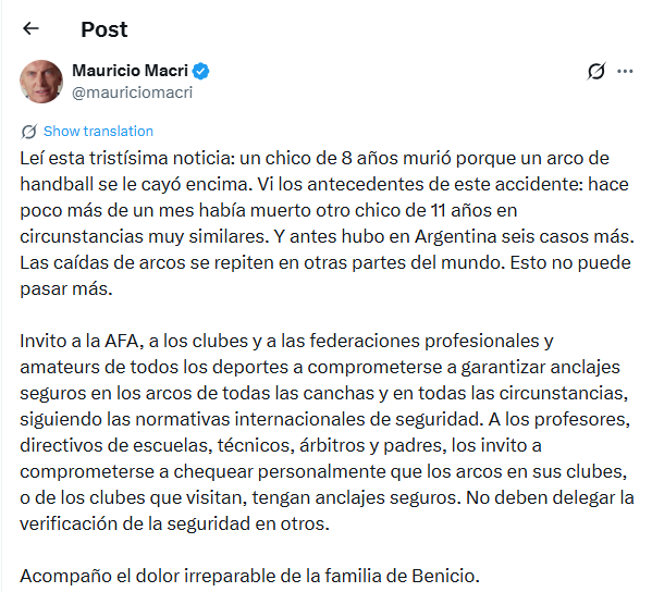 Por su parte, el expresidente Mauricio Macri también se había referido al tema: "Invito a la AFA, a los clubes y a las federaciones profesionales y amateurs de todos los deportes a comprometerse a garantizar anclajes seguros en los arcos de todas las canchas y en todas las circunstancias, siguiendo las normativas internacionales de seguridad".