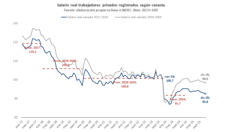 El escrito parte de una contradicción: si entre 2023 y 2025, en el promedio, los salarios registrados privados apenas perdieron 1,5% de poder adquisitivo, ¿por qué aumentó significativamente la cantidad de personas con pluriempleo así como la cantidad de horas trabajadas y la demanda no se recupera?