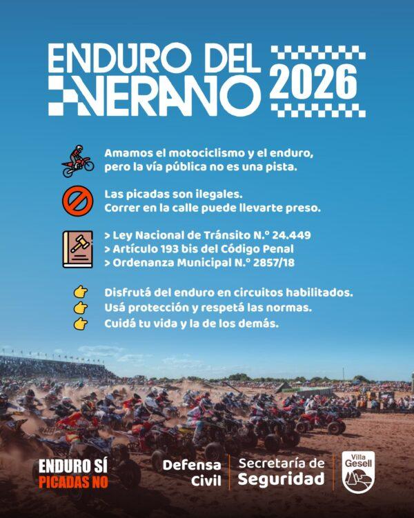 El Enduro del Verano 2026 celebrará su 31ª edición en la arena geselina entre el 20 y el 22 de febrero, en el tradicional Circuito Municipal ubicado en la Ruta 11, kilómetro 407. La competencia reúne cada año a más de 1.300 pilotos y convoca a alrededor de 130.000 espectadores, consolidándose como uno de los eventos de motociclismo más grandes del mundo. El acceso al predio será libre y gratuito, con la condición de colaborar con un alimento no perecedero o un útil escolar, reforzando así el compromiso social del evento con la comunidad.